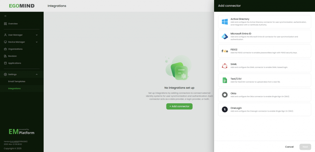 Das Dialogfeld Konnektor hinzufügen wird angezeigt. Der Konntektor-Typ, welcher der Organisation bereits hinzugefügt wurde, wird nicht zur Auswahl angezeigt.