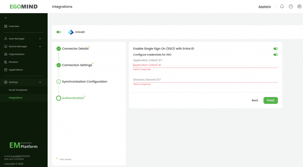 Damit das EntraID Single Sign On (SSO) (falls in EntraID eingerichtet) zur Anmeldung an der EMPlatform und Appterix verwendet werden kann, aktivieren Sie im letzten Schritt diese Funktion und hinterlegen die Anwendungs-ID und Verzeichnis-ID.