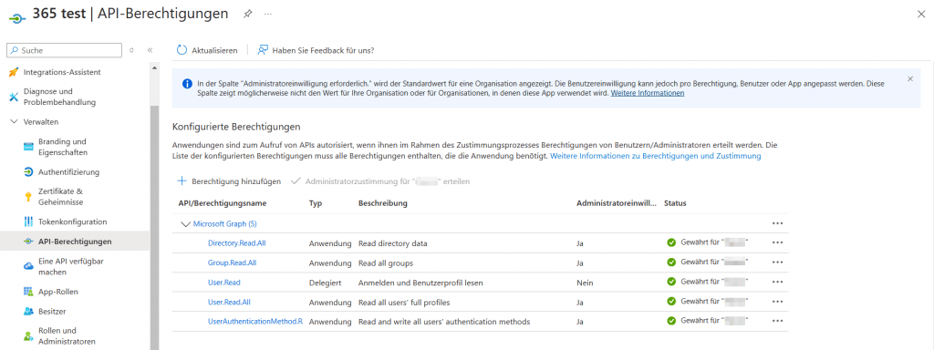 - Stellen Sie sicher, dass die Administratorzustimmung für die angeforderten Berechtigungen erteilt wird.