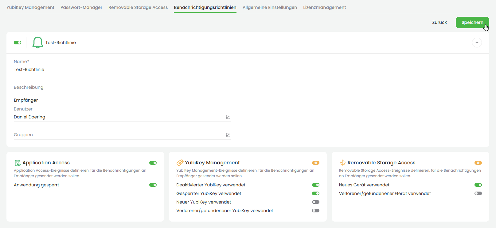• Deaktivierter YubiKey verwendet: Eine Benachrichtigung wird gesendet, wenn versucht wird, einen YubiKey zu verwenden, der deaktiviert wurde.
