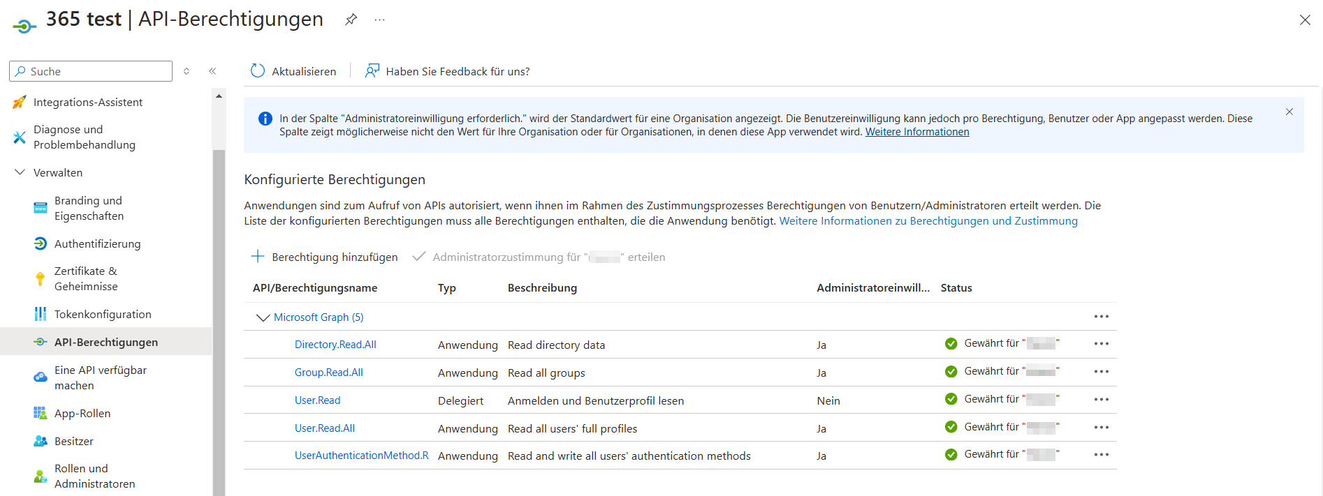 - Stellen Sie sicher, dass die Administratorzustimmung für die angeforderten Berechtigungen erteilt wird.