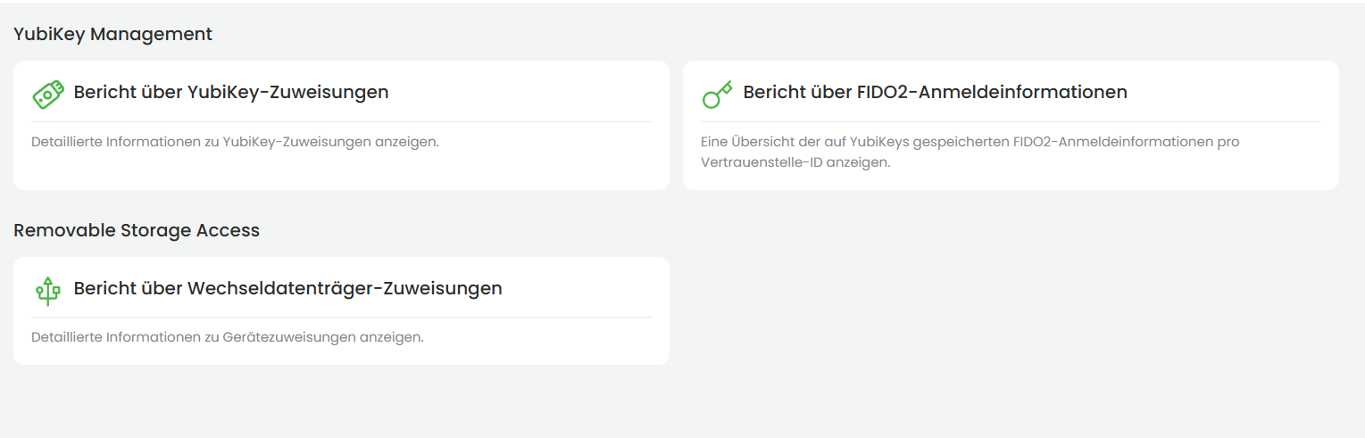 Berichte liefern wertvolle Einblicke, zum Beispiel in die Zuweisung von YubiKeys und Wechseldatenträgern sowie weitere relevante Bereiche.