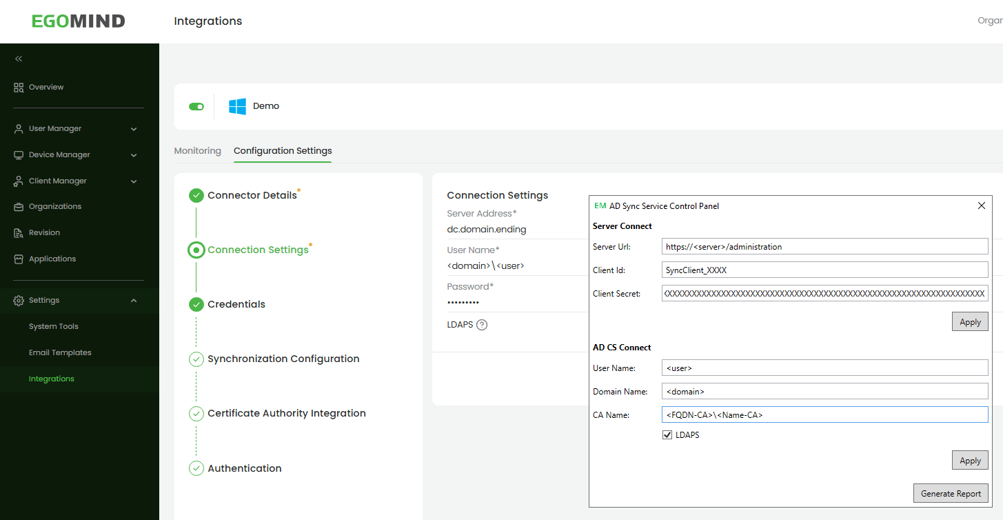 Mit dem AD Sync Control Panel lassen sich Änderungen an der Serververbindung zur EgoMind Plattform, sowie die Initialisierung der Verbindung mit der AD Zertifizierungsstelle vornehmen.