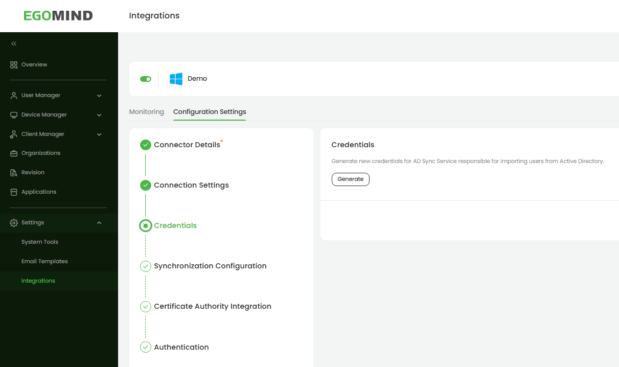 Die Server URL, Client ID und den Client Secret erhalten Sie in der Web-Oberfläche der EgoMind Plattform unter Einstellungen > Integrationen > Konfigurationseinstellungen > Anmeldeinformationen nach dem Klick auf den Generieren-Button.