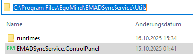 Das AD Sync Control Panel wird mit der Appterix Komponente des AD Sync Service installiert. Das AD Sync Control Panel befindet sich im Ordner Utils des Installationspfades des AD Sync Service (standardmäßig: C:\Program Files\EgoMind\EMADSyncService\Utils). Es lässt sich ‚als Administrator‘ am Server des AD Sync Service ausführen.